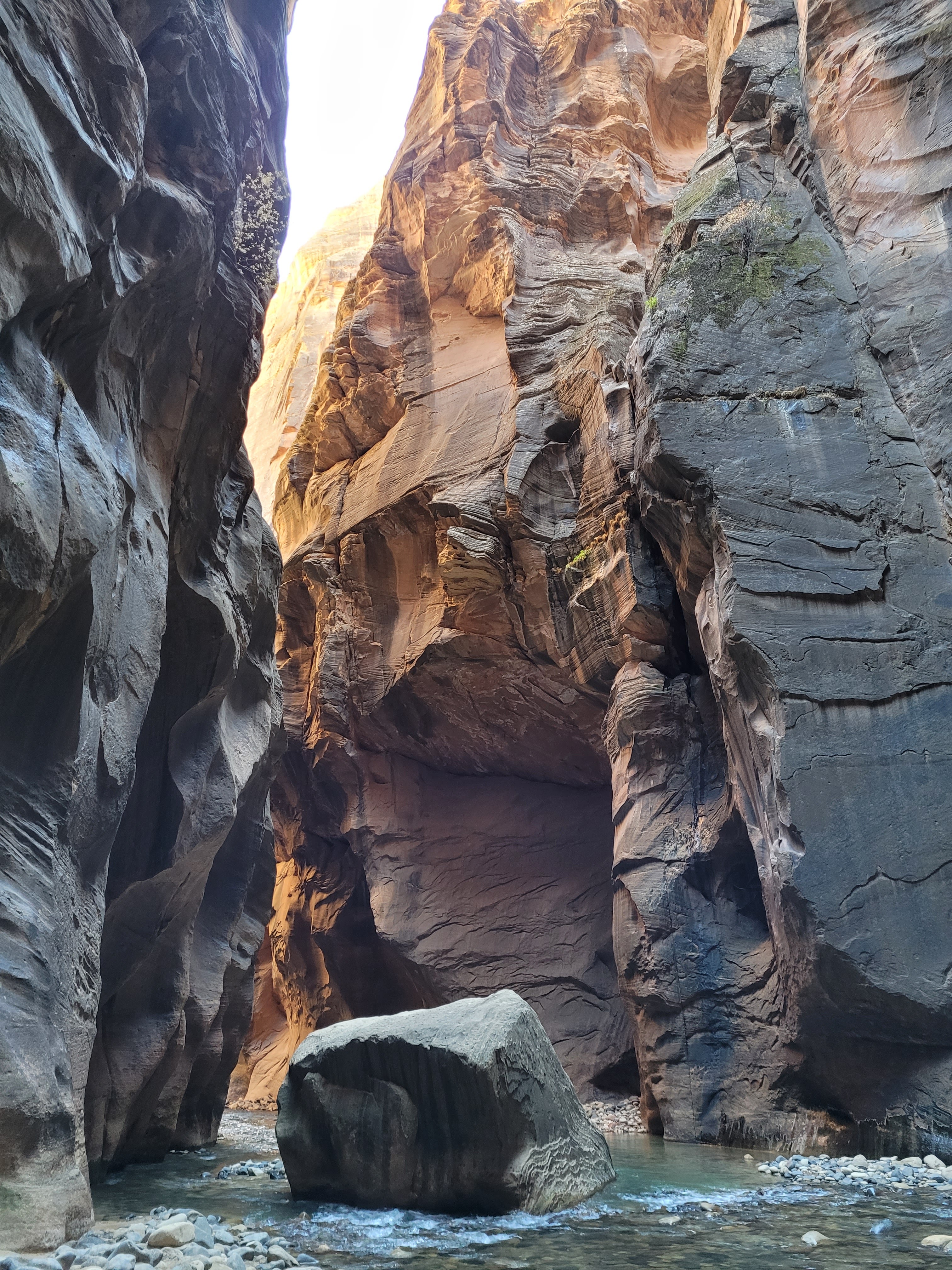 Eventually we reached some impassable sections. We turned back here and returned to the Narrows, carefully retracing our steps down the slippery rocks which are much harder to descent than to climb. You need a permit to travel above the falls, and the route is classically done from the top-down with two rappel sections as a beginner canyoneering route.